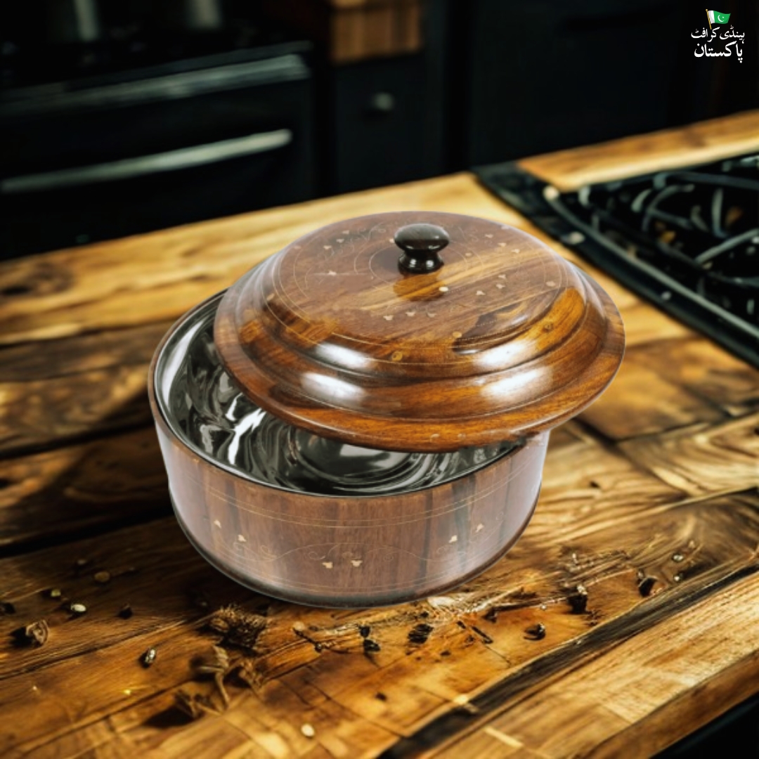 Serve your favorite dishes in style with our Beautiful Carved Wooden Hotpot! This special hotpot has a steel bowl inside and pretty carvings outside, making it perfect for family meals.